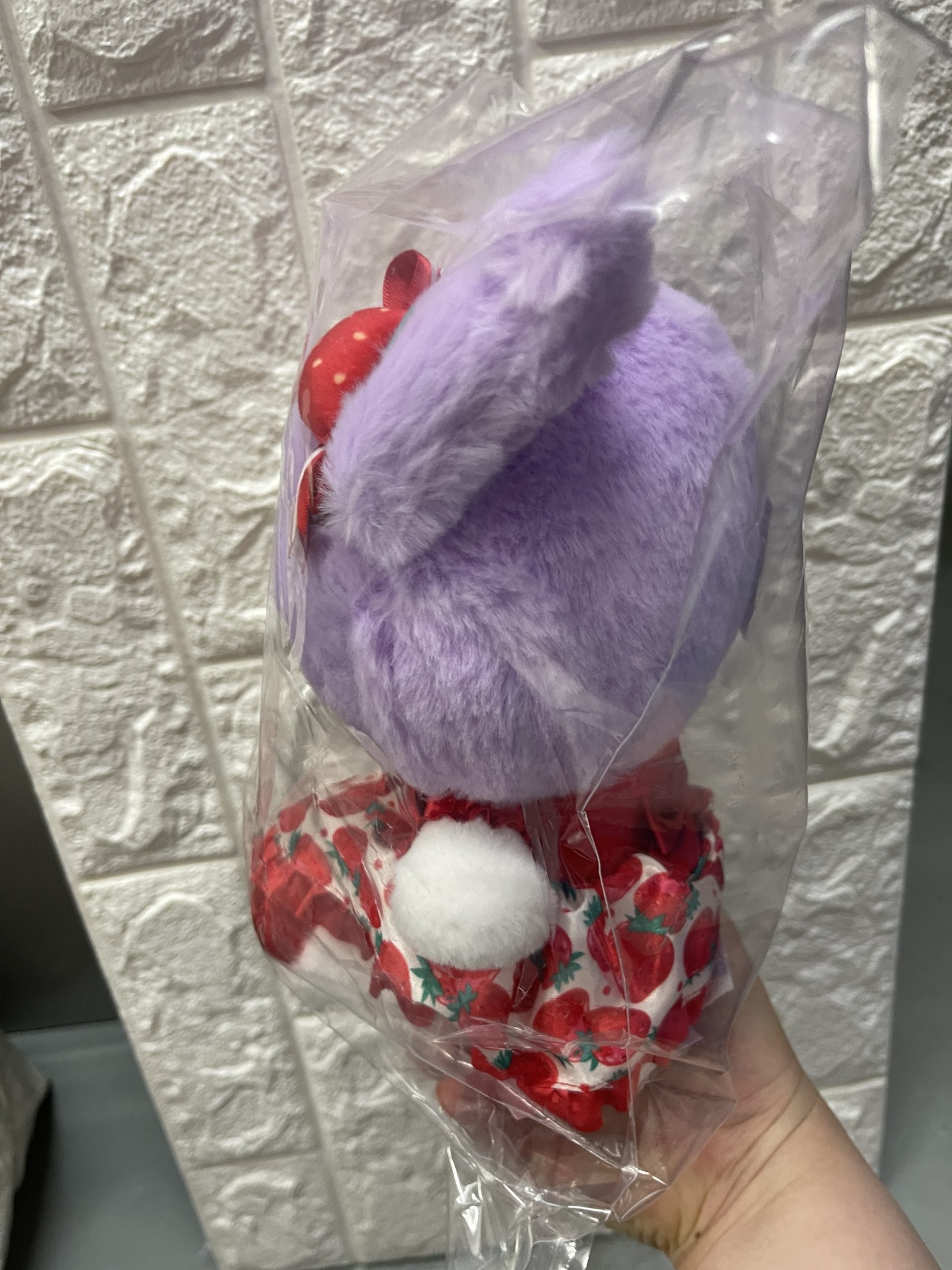 Kuromi穿著草莓圖案的連身裙,戴著絲帶,看起來很喜慶★炫耀一下♪